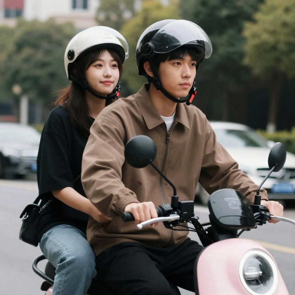 Photograph of two people on a pink scooter. The man in front wears a brown jacket and black helmet, with neutral expression. The woman behind wears a white helmet, black top, and has a slight smile. Background includes trees, buildings, and a Mercedes car. The man holds the handlebars, the woman sits behind him.