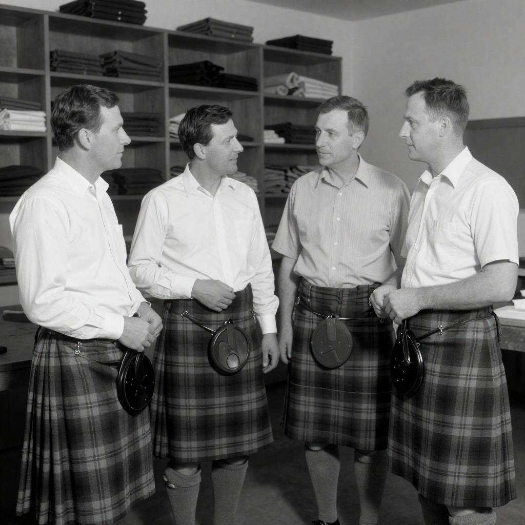 Black-and-white photograph of four men in a workshop, standing in a row and examining plaid kilts. They wear white shirts and hold the kilts, which have a checkered pattern. The background shows wooden shelves and a cluttered workspace. The men are engaged in conversation, focusing on the kilts.