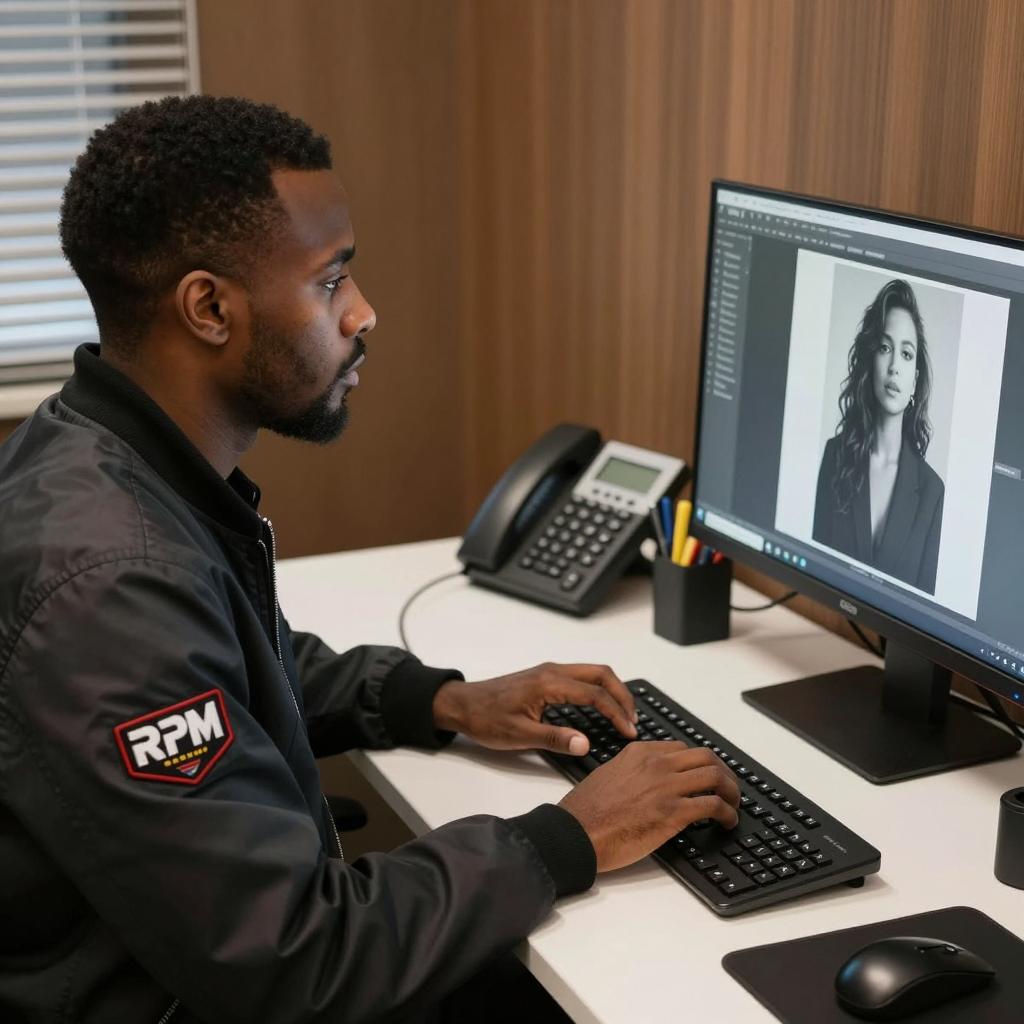 A Black man with short hair and a beard sits at a desk, wearing a dark jacket with an "RPM" patch. He looks to the right while typing on a computer. The monitor displays a black-and-white photo of a woman. Desk items include a keyboard, mouse, phone, and office supplies. The background includes wooden walls and blinds.