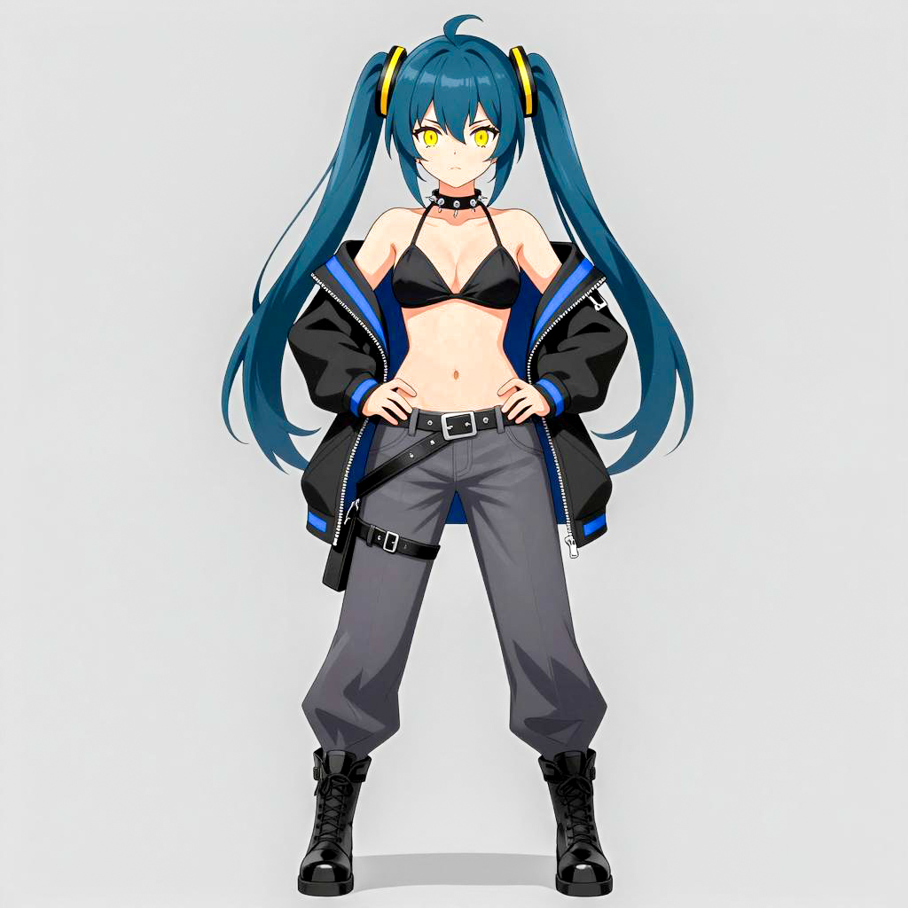 Digital illustration of an anime-style girl with dark blue twin-tailed hair, yellow hairbands, yellow eyes, wearing a black bikini top, black jacket with blue stripes, grey pants, black boots, and a spiked choker. She stands confidently with hands on hips, background is grey.