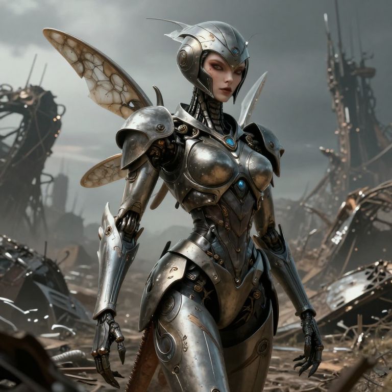 A highly detailed CGI image depicts a female cyborg warrior with metallic silver armor and insect-like wings. Her armor has intricate patterns and glowing blue accents, highlighting her curvaceous, humanoid form with large breasts. She wears a futuristic helmet with antennae. The background is a dystopian, war-torn landscape with scattered debris and damaged machinery. The sky is overcast, adding a grim, post-apocalyptic atmosphere. The cyborg's expression is stern and focused, with pale skin and red lips. The image combines elements of science fiction and cyberpunk aesthetics.