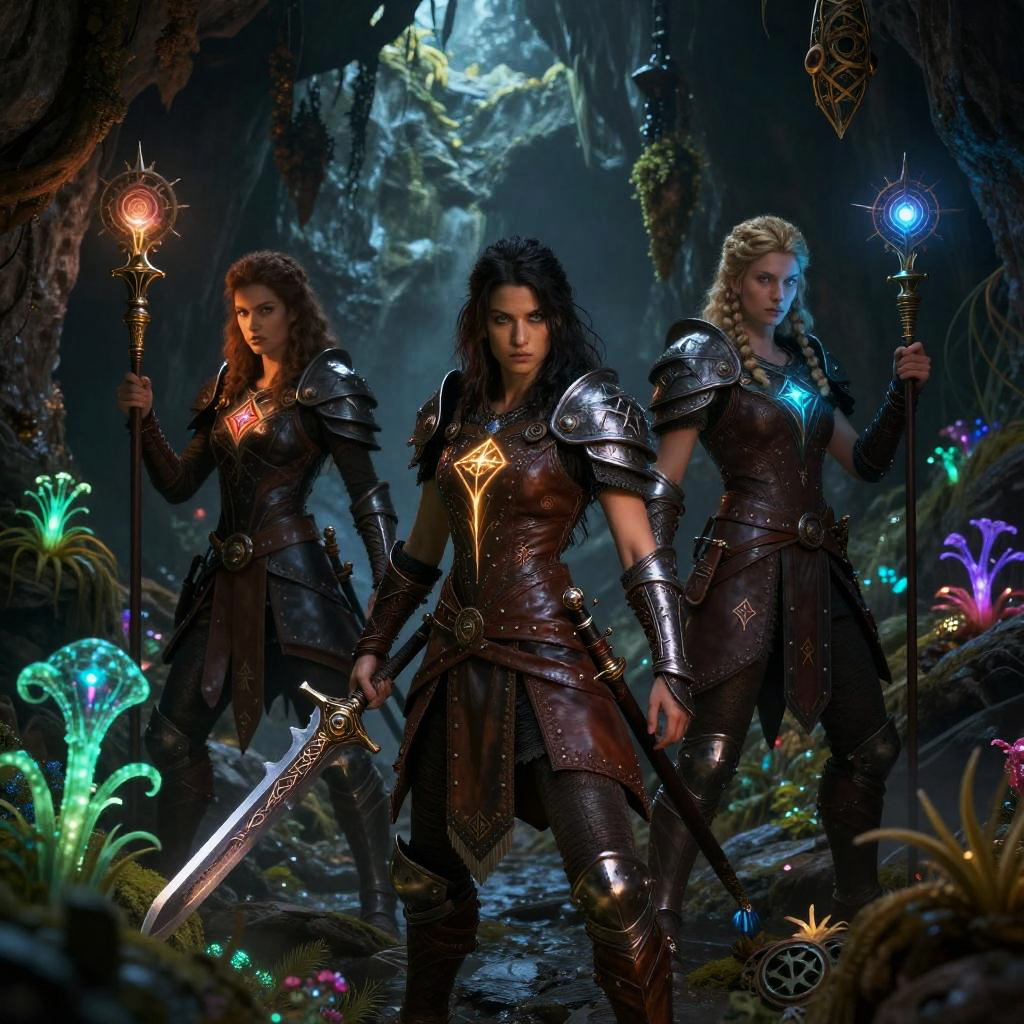 Fantasy art characters in a dark, enchanted cave illuminated by bioluminescent plants, wearing leather and metal armor adorned with arcane symbols, eyes glowing with magical energy, detailed textures on their weapons and mystical artifacts, atmosphere rich with mystery and danger.