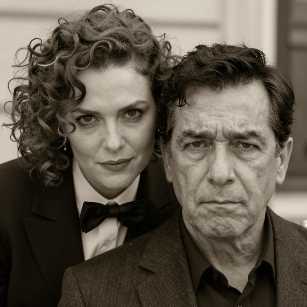 A close-up photo of a woman with curly red hair wearing a black top, gently kissing an older man with short gray hair dressed in a gray suit, white shirt, and pocket square. The man and woman have serious expressions. The woman places her hand on the man's chest while his left hand rests on his chest. The background is blurred with warm orange and black tones, suggesting an indoor event or formal gathering.