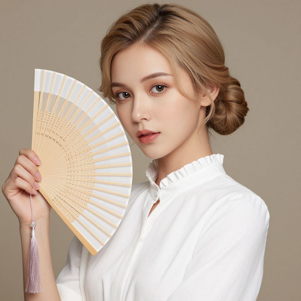 Portrait of a young woman with golden hair styled in an elegant updo, wearing a crisp white blouse with ruffled collar, holding a delicate wooden fan that rests gracefully against her shoulder.