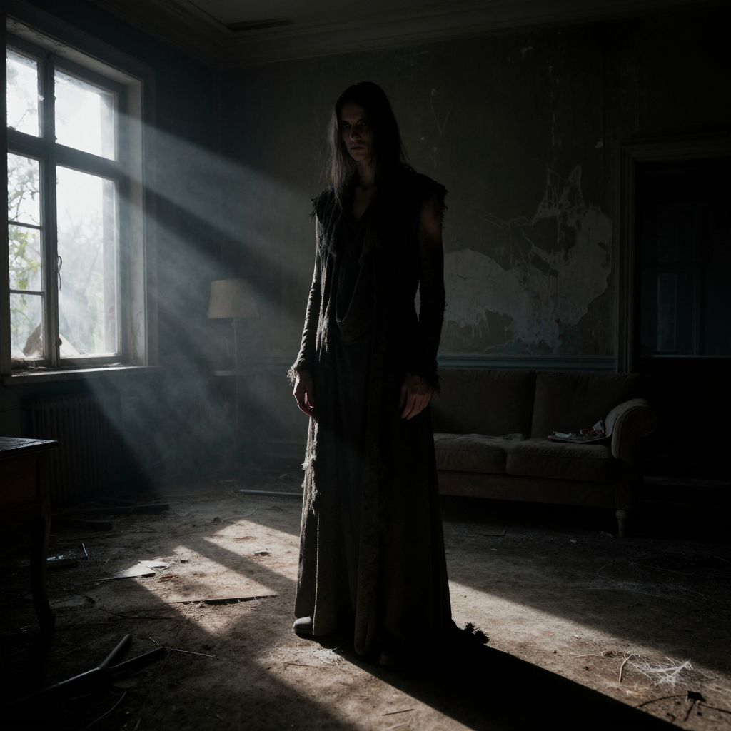 [[man,dark abandoned room]]Mysterious figure, tall, slender frame, dressed in worn, tattered clothing, stands alone in dimly lit, abandoned room, early morning sunlight seeping through broken windows, casting long, ominous shadows across dusty, cobweb-covered furniture, walls adorned with peeling paint, eerie silence palpable. Man has masculine face and piercing eyes
