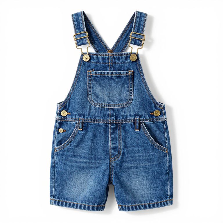 Blue denim dungaree shorts for toddlers featuring adjustable shoulder straps with gold buckles, two front pockets with button closures, and a central chest pocket, designed for ages two to four.