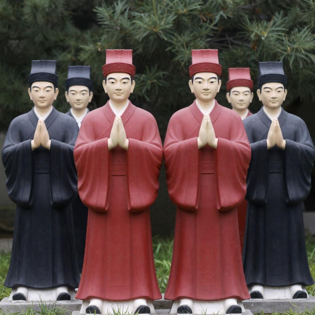 Photograph of six statues of Asian men in traditional red and black robes with tall, ornate hats, standing in a row. Green foliage in the background. Statues have pale faces, neutral expressions. Two central statues in red, others in black. Hands raised in a prayer-like gesture. Grass in foreground.