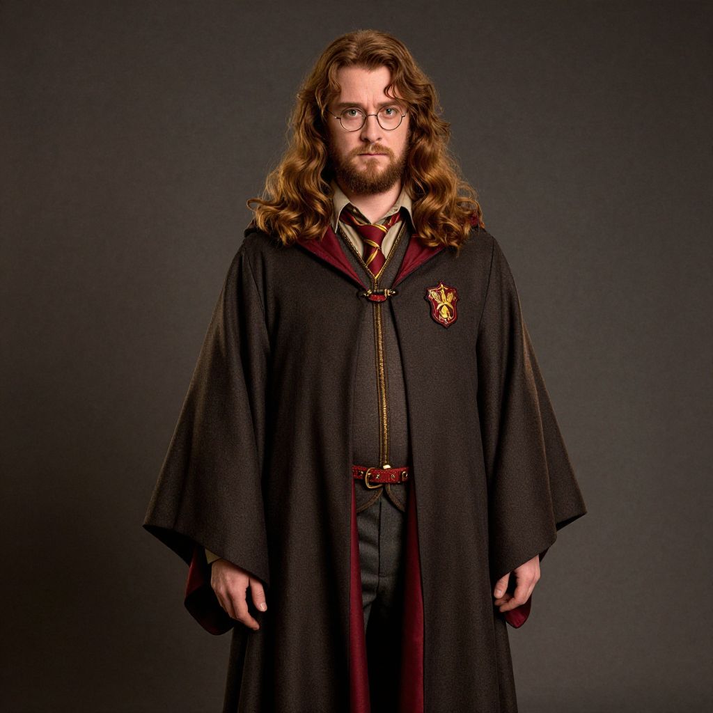 Harry Potter Hagrid Costume, man in a brown robe and a red belt