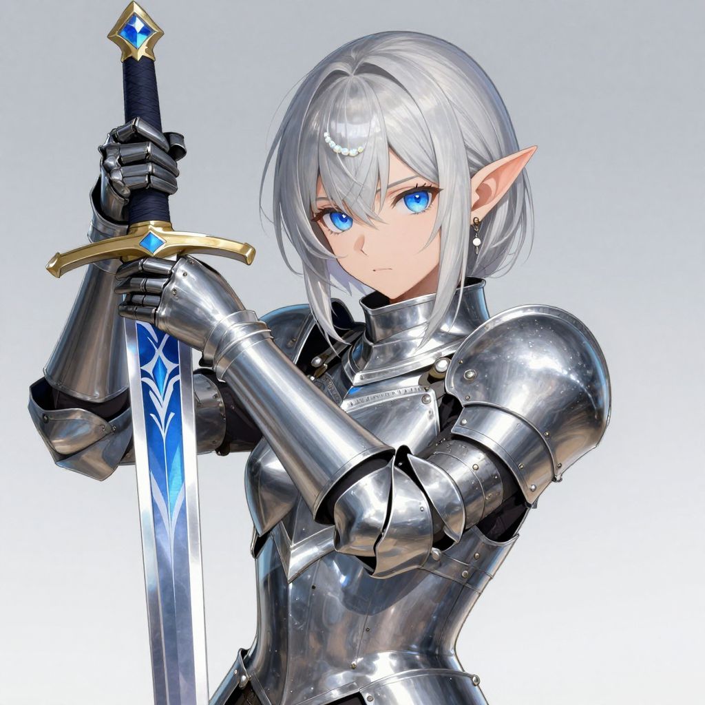 Half body shot, anime female, rugged woman knight, holding a sword, ultra detailed sword with blue insignias on it, silver white hair, blunt bangs, pointy elf ears, pearl opal, sword, dazzling, transparent, burnished silver, steel armor, shine armor, detailed Illustration, official artwork, official art, beautiful detailed eyes, blue eye, silver color palettes