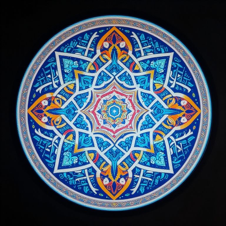 Vibrant, circular, digital mandala with intricate blue, white, and orange patterns, featuring symmetrical geometric shapes and Arabic calligraphy, set