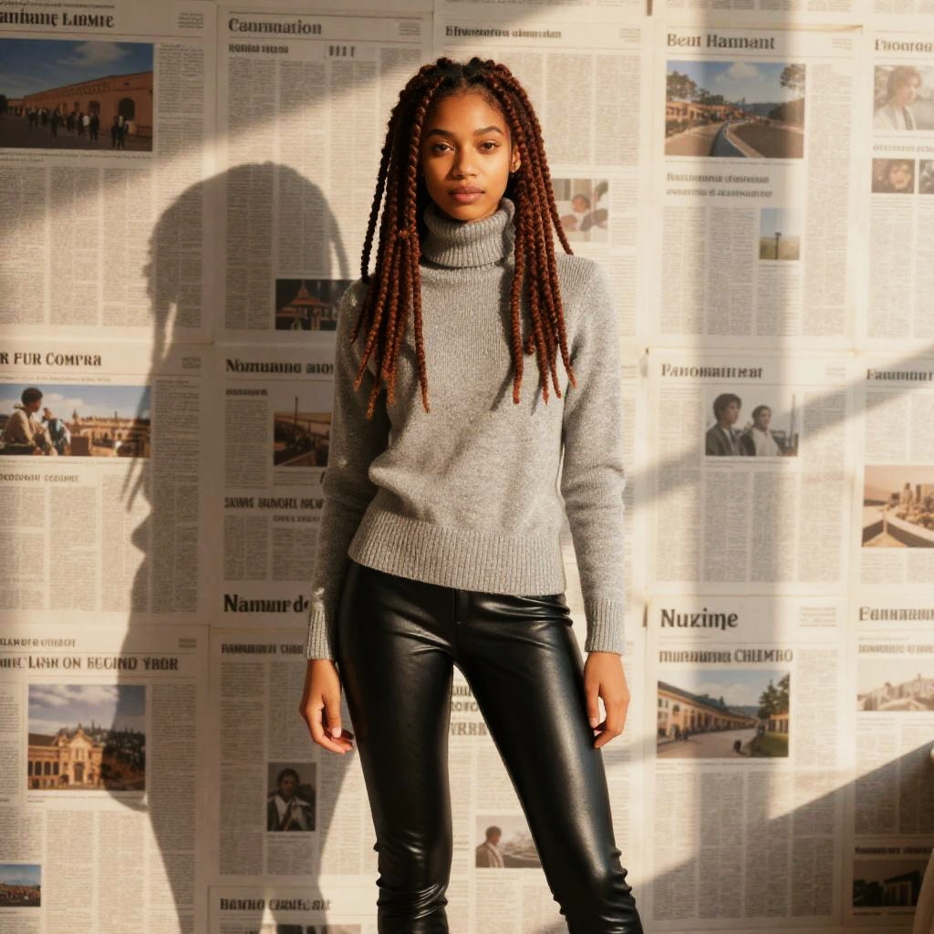 Photograph of a young Black woman with medium-brown skin and long, dark brown braided hair standing against a backdrop of newspapers. She wears a light gray, turtleneck sweater and black, shiny leather pants. Her shadow is cast prominently to the left, and sunlight streams in from the right, creating a stark contrast. Her expression is neutral, and she stands with her arms relaxed by her sides. The newspaper background includes headlines and small images, adding a textured, urban feel to the image. The overall style is modern and edgy.