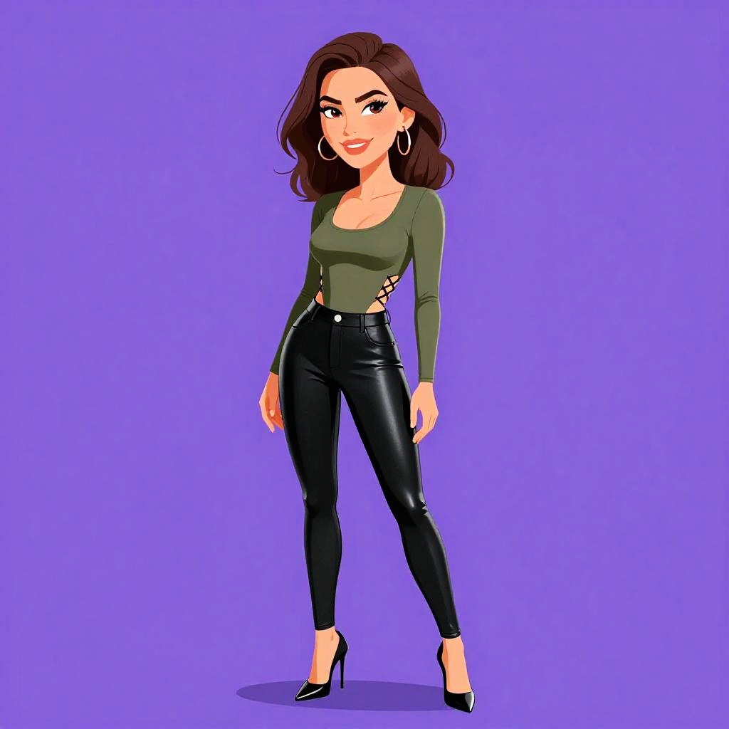 Digital illustration of a smiling woman with brown hair, wearing a black and white "Popcorn" crop top, and dark purple leather pants, against a