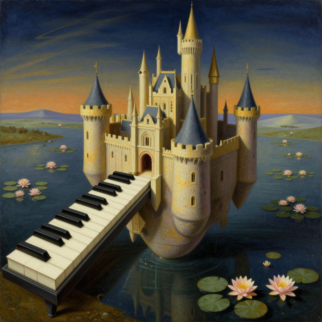 Craft an image imbued with the whimsical surrealism of Dali's paintings, depicting a fantastical fusion of a grandiose medieval castle and an elegant piano. The castle gracefully hovers above a tranquil pond adorned with water lilies, its towers transformed into gleaming piano keys, creating a captivating musical landscape. Capture this enchanting scene from a bird's-eye view, showcasing the delicate interplay between the keys and lilies bathed in soft, shimmering light that casts gentle reflections on the glassy surface. Emphasize the dreamlike ambiance with intricate textures reminiscent of melting elements and a harmonious blend of warm gold and amber tones with cool shades of deep indigo, evoking a sense of wonder, serenity, and musical unity within this whimsical realm.