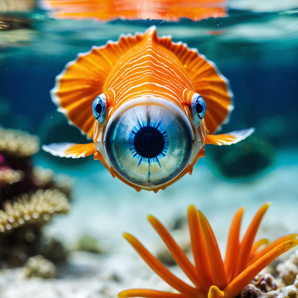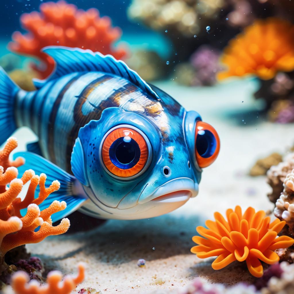 Underwater close-up image of a fantasy fish with bright orange and white patterns, unusually large blue eyes, swimming among vibrant orange and purple coral formations. The background is softly blurred to emphasize the fish's detailed texture and vivid colors.