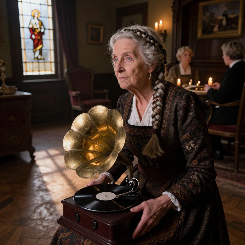 Photograph of an elderly white woman with gray hair in a braid, wearing a black lace dress and white blouse, sitting in a dimly lit, Victorian-style room. She holds a vintage gramophone with a golden horn and a black record. In the background, two older women are seated at a table with lit candles, and a stained glass window is visible. The room has wooden floors, dark furniture, and framed pictures on the walls, creating a warm, historical atmosphere. The woman's expression is focused and contemplative.