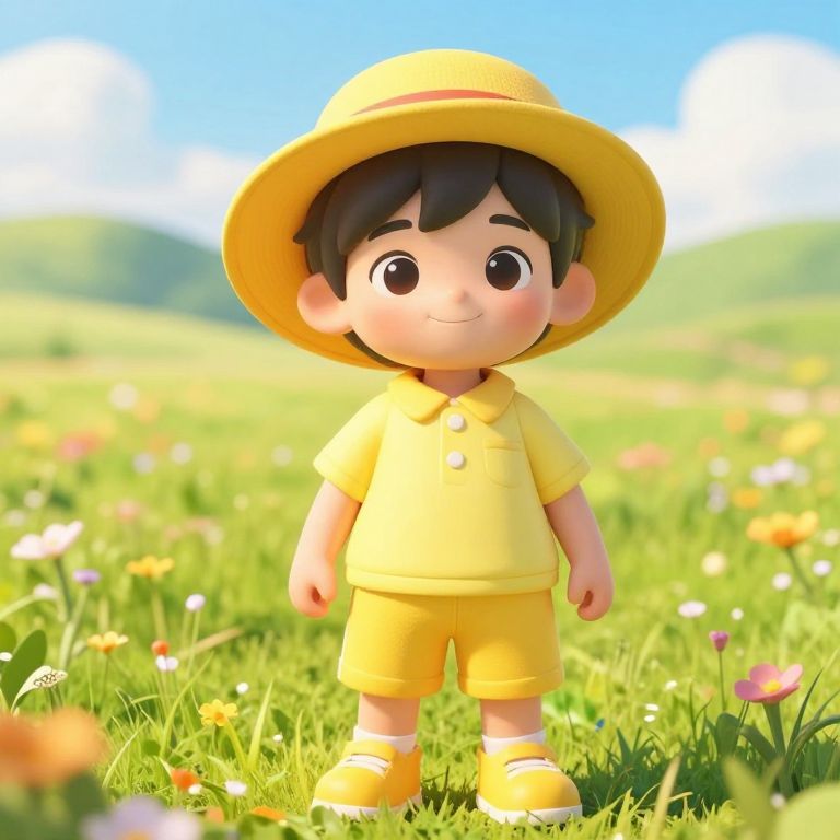 A cartoon character with a green outfit and a green cap, featuring bright, expressive eyes, a friendly smile, and a lively, whimsical style with soft outlines and vibrant colors, standing in a sunny, colorful forest backdrop with floating flowers and a gentle breeze. The character is a cheerful, youthful figure with round cheeks and a playful demeanor, exuding warmth and energy. The forest is filled with lush, vibrant plants, soft sunlight filtering through the trees, and delicate flowers drifting in the air like tiny parachutes, creating a dreamy, magical atmosphere with gentle ripples of wind that gently sway the leaves and petals. The overall mood is joyful and inviting, blending nature and fantasy in a beautifully balanced, hand-drawn aesthetic.