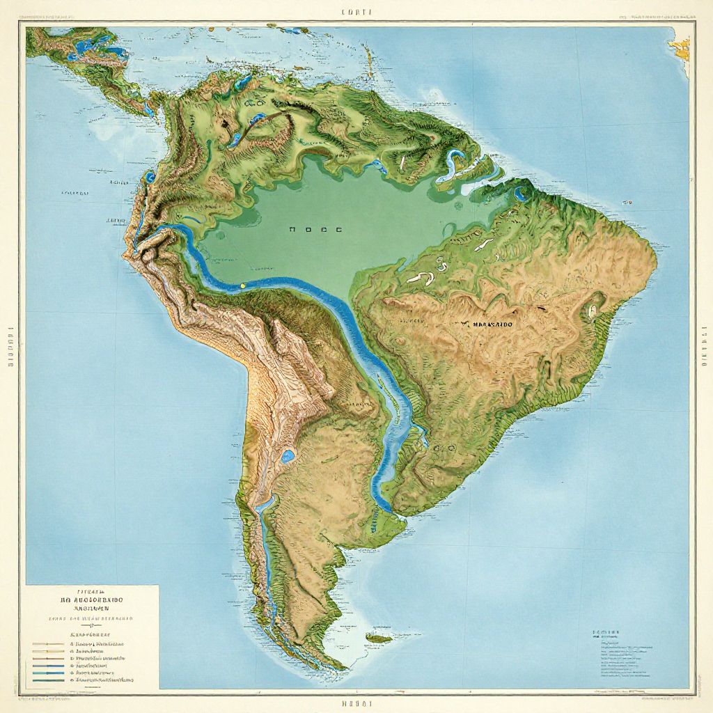 Detailed topographic map of South America, highlighting elevation, waterways, and country borders, with vibrant green, brown, and blue colors.