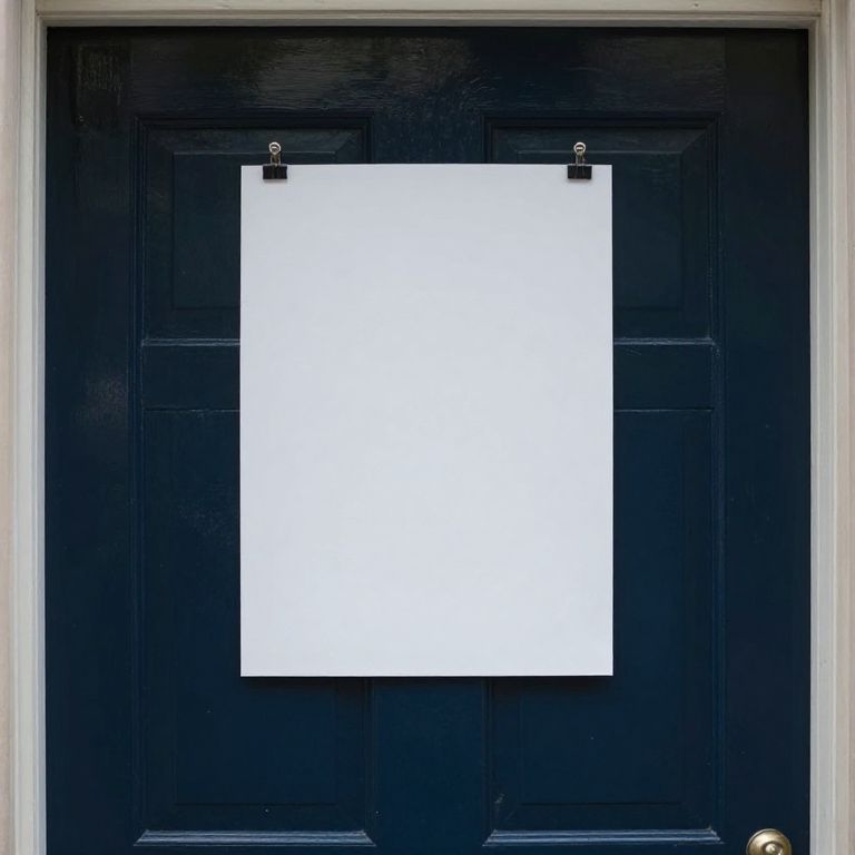 Photograph of a dark navy blue wooden door with a white rectangular blank paper sheet centered and held by two black binder clips at the top. The door has vertical paneling and is framed by a white trim. The bottom right corner of the door features a round, silver-colored door handle. The paper is bright white, contrasting sharply with the dark door. The overall image is simple and minimalistic, with a clean, modern aesthetic.