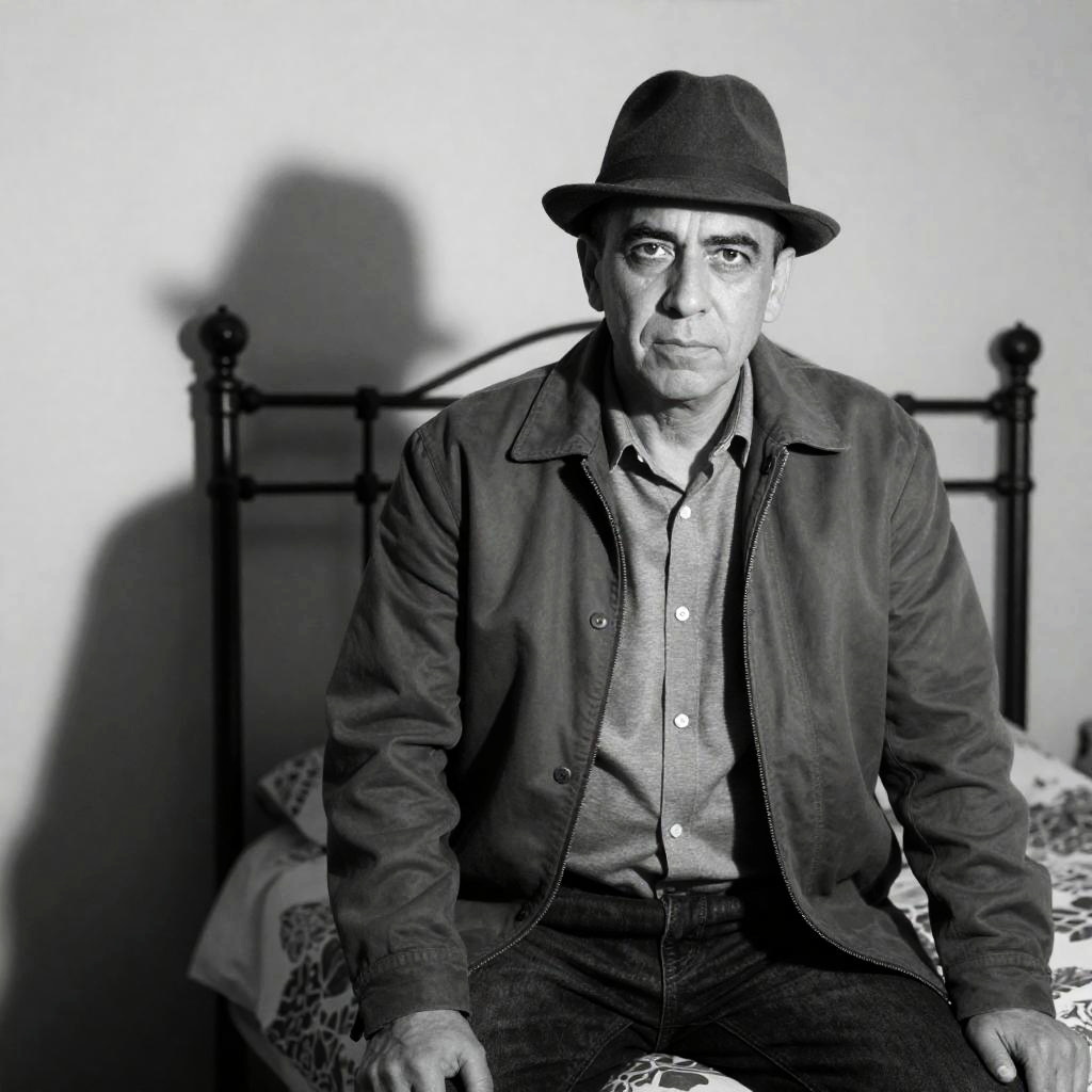 Black-and-white photograph of a middle-aged man with a serious expression, wearing a hat, jacket, and button-up shirt, sitting on a bed with an ornate metal headboard. Shadow on the wall to his left. Patterned bedspread.