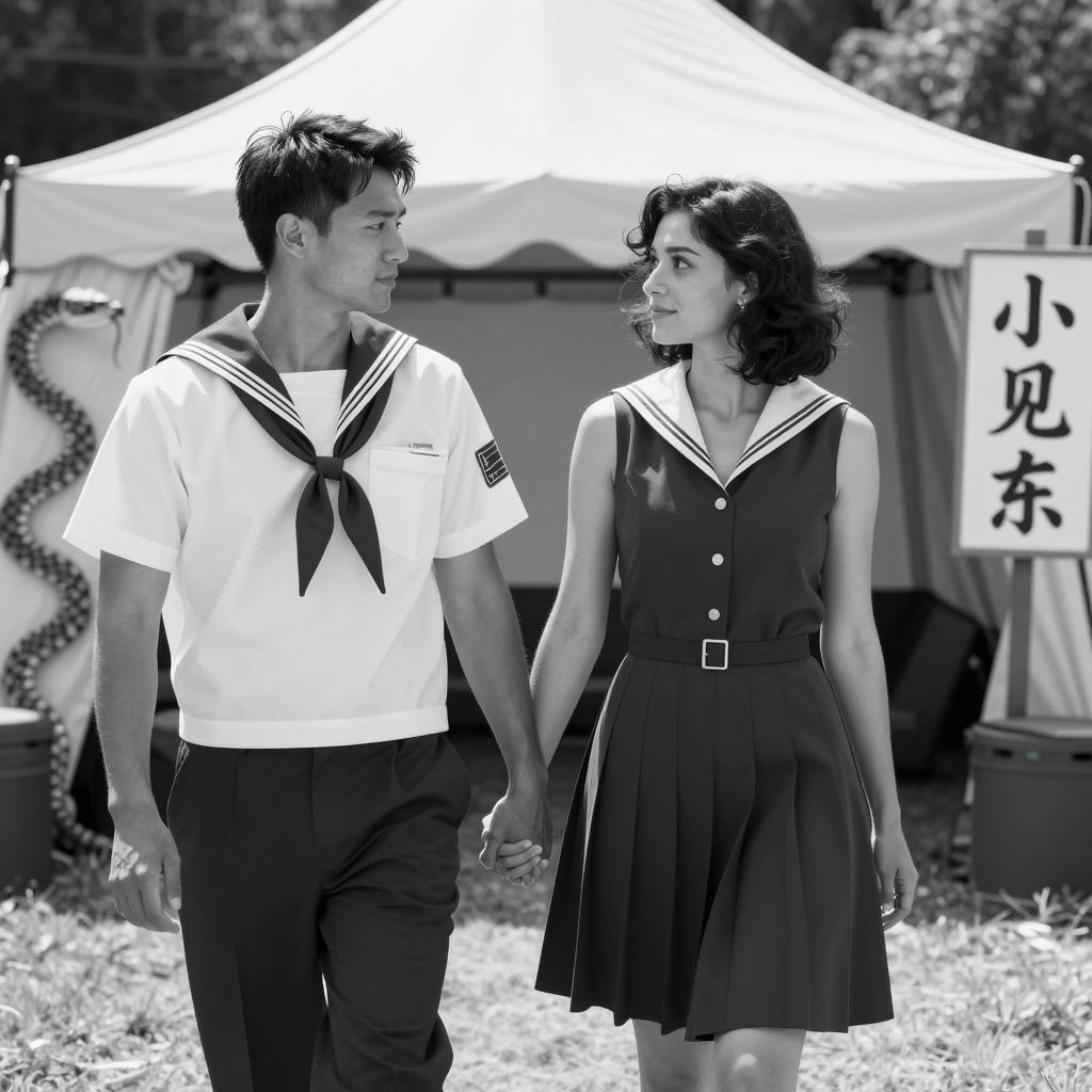 Black and white photograph of a smiling woman in a light-colored short-sleeve blouse and striped bow tie, riding a bicycle with a man hugging her from behind. Background includes city street, pedestrians, vintage cars, and buildings. Man has closed eyes, woman has short, curled hair. Two people in foreground, several in background.