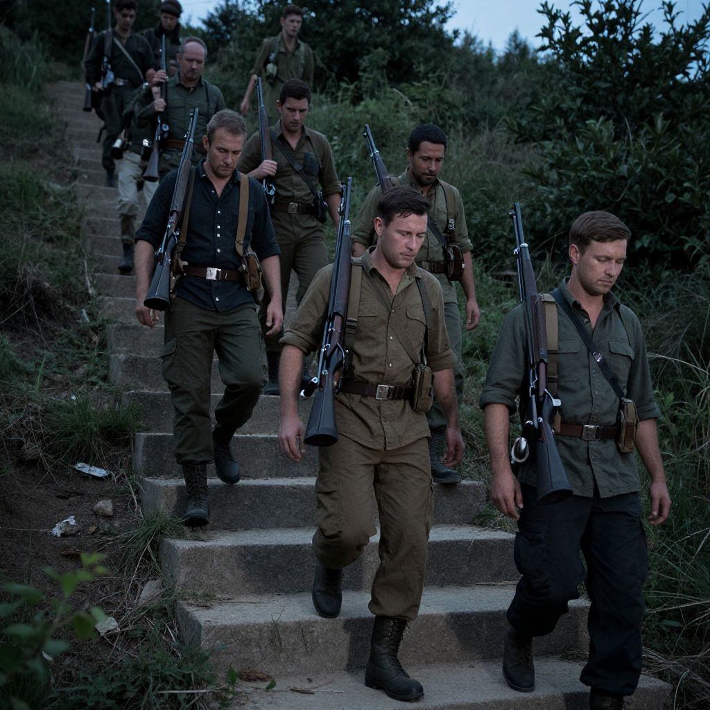 Victorious a group of men, shouldered hunting rifles climb concrete steps in the countryside, cinematic, low light real photograph, high detail,
