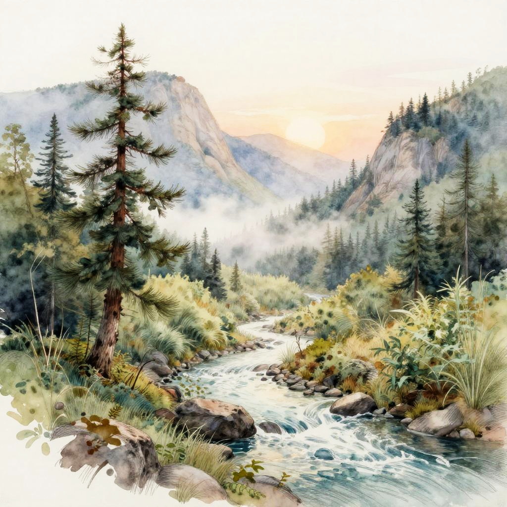 Landscape drawing realistic style, a serene mountain valley at sunrise with detailed trees, flowing river, and misty atmosphere, soft watercolor textures and delicate pencil shading blending nature's tranquility and precise artistry.