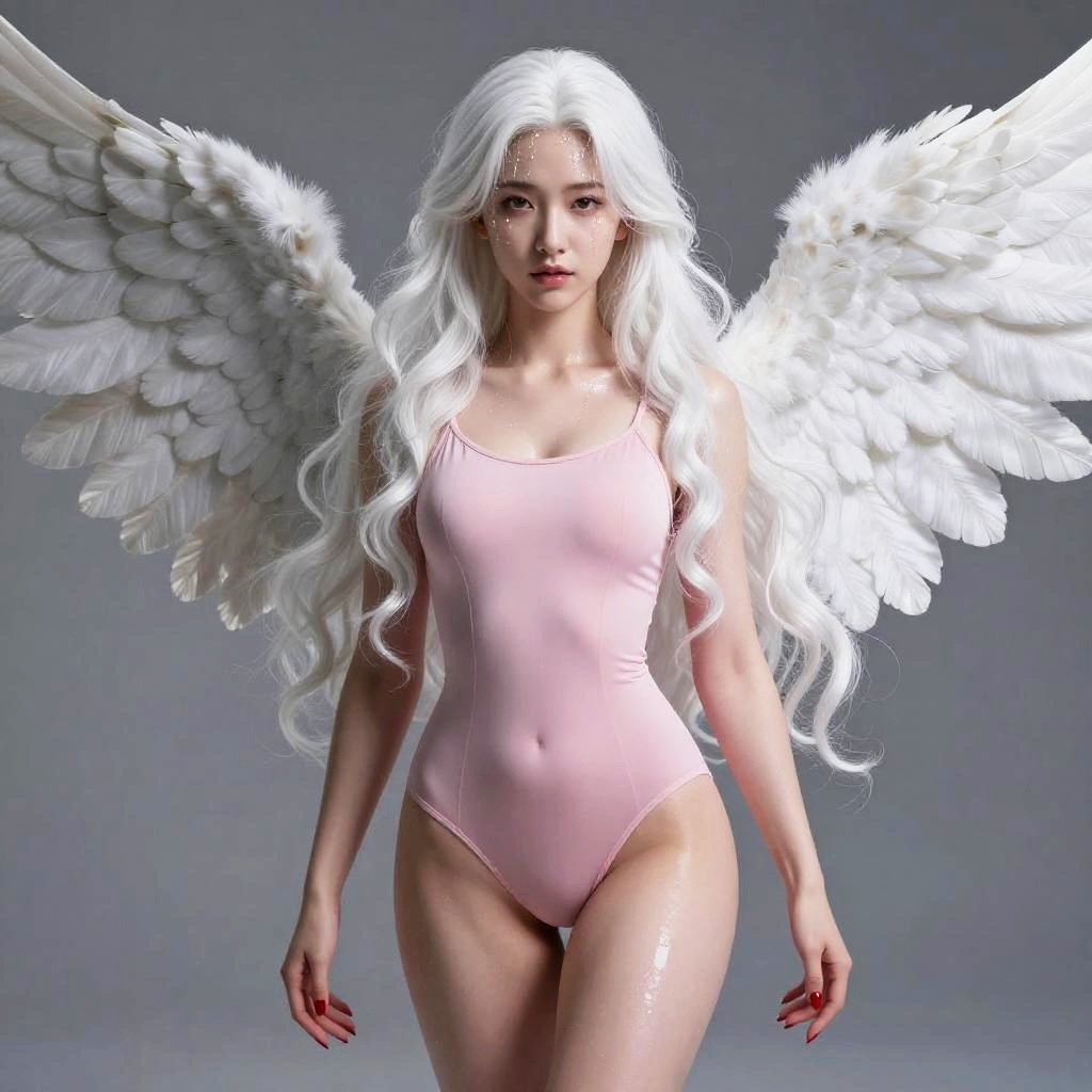 Photorealistic digital artwork of a fair-skinned, white-haired angelic woman with large, white feathered wings. She has long, wavy hair, red lips, and a slender yet curvy physique. She wears a form-fitting, pale pink one-piece leotard that accentuates her figure. The background is a gradient of gray, adding depth. Her expression is serene, and her skin has a glossy, almost ethereal sheen. The lighting highlights the texture of her wings and the smoothness of her skin. The overall style is hyper-realistic, focusing on detailed textures and soft lighting.