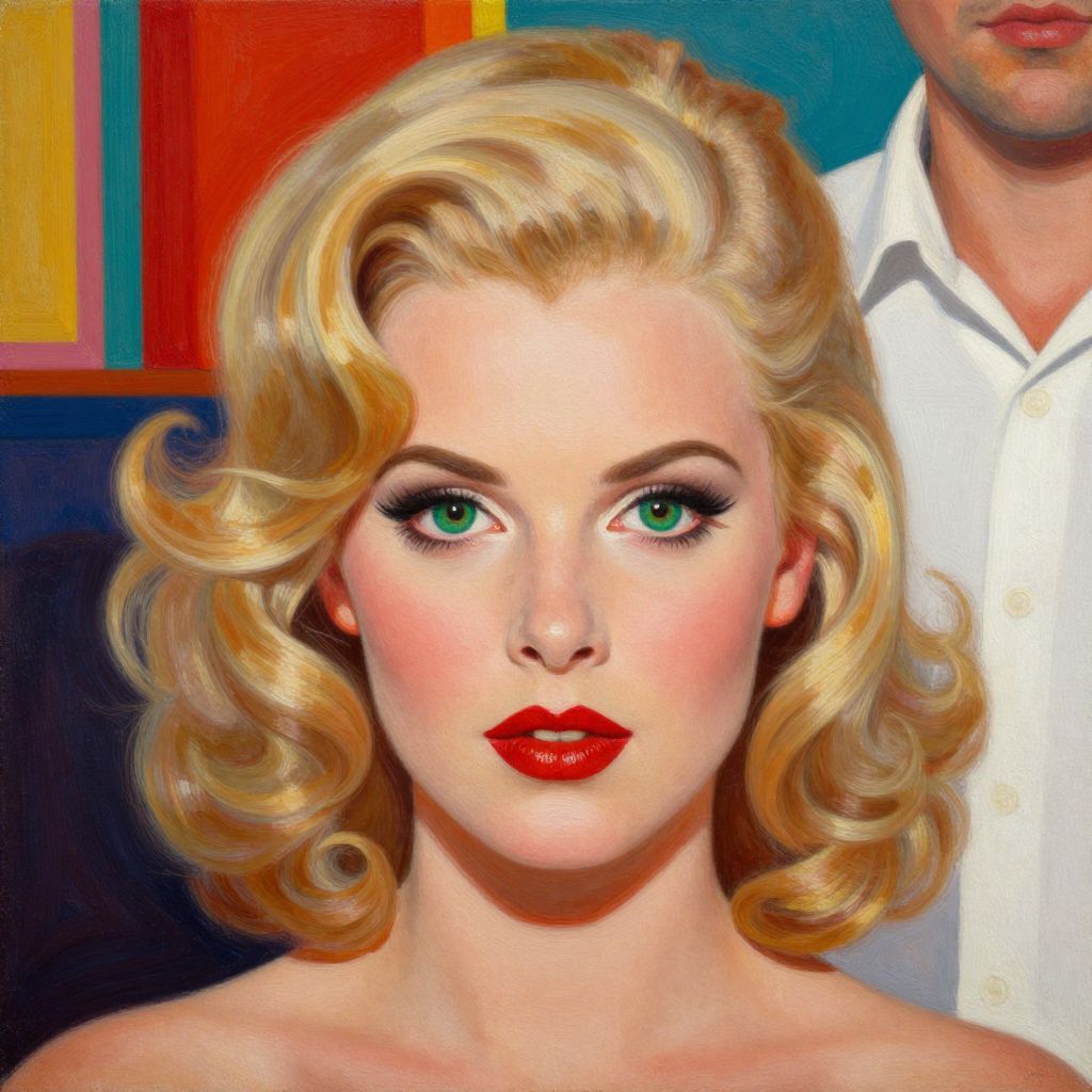 Vibrant oil painting by Peregrine Heathcote captures a retro-style portrait of a woman with striking green eyes, voluminous blonde curls, and bold red lips, set against a backdrop featuring a man in a white shirt, all rendered with meticulous detail and vivid color contrast.