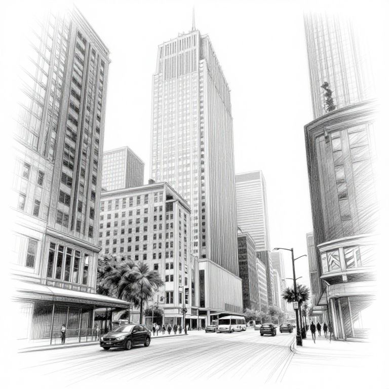 Change picture to sketch, urban cityscape with skyscrapers and street details, rendered in fine graphite pencil style, sharp lines and subtle shading, dynamic perspective with hand-drawn architectural elements blending realism and artistic sketch technique