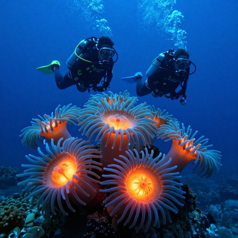 Two scuba divers illuminate a mesmerizing underwater scene where six vibrant, glowing sea anemones radiate warm orange centers and translucent blue tentacles, creating a surreal contrast against the deep blue ocean backdrop.