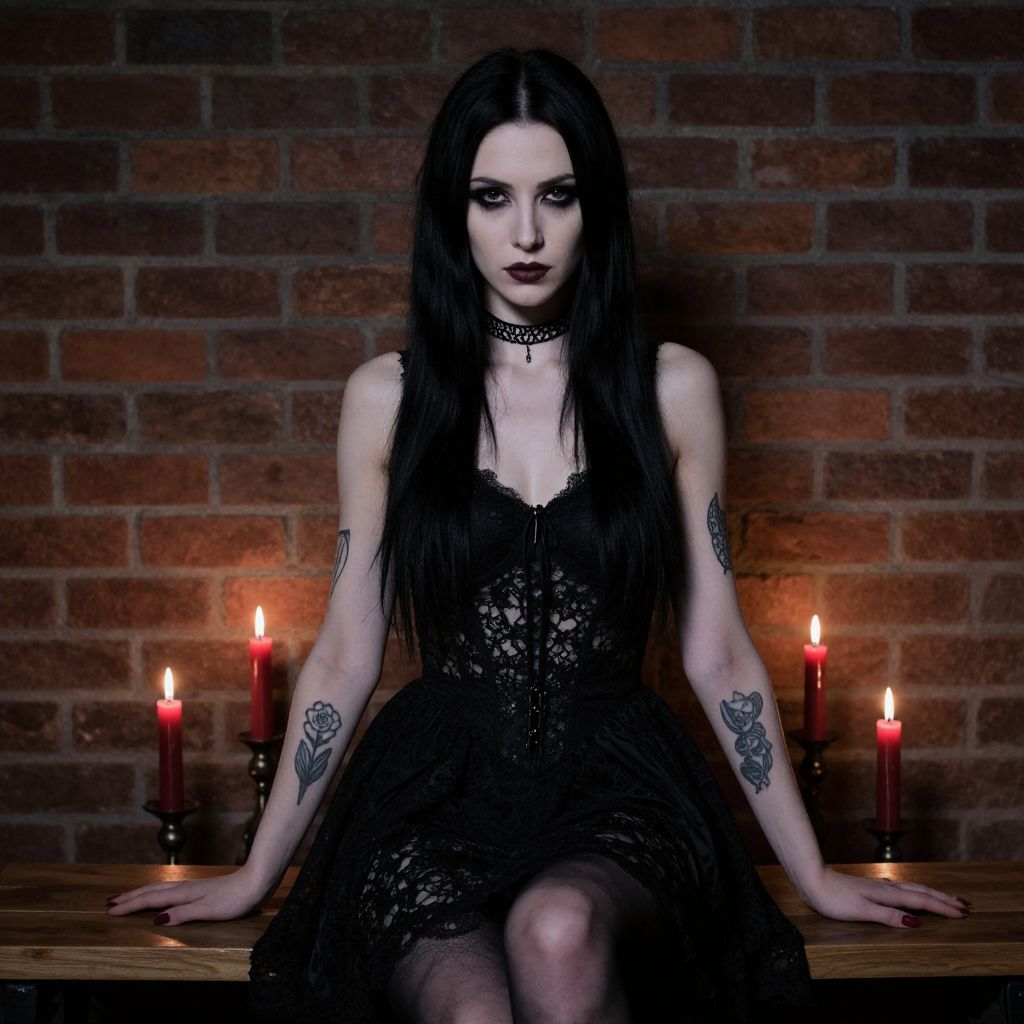 Gothic woman with long black hair, dark lipstick, lace dress, choker, tattoos, sitting on wooden table, three red candles, brick