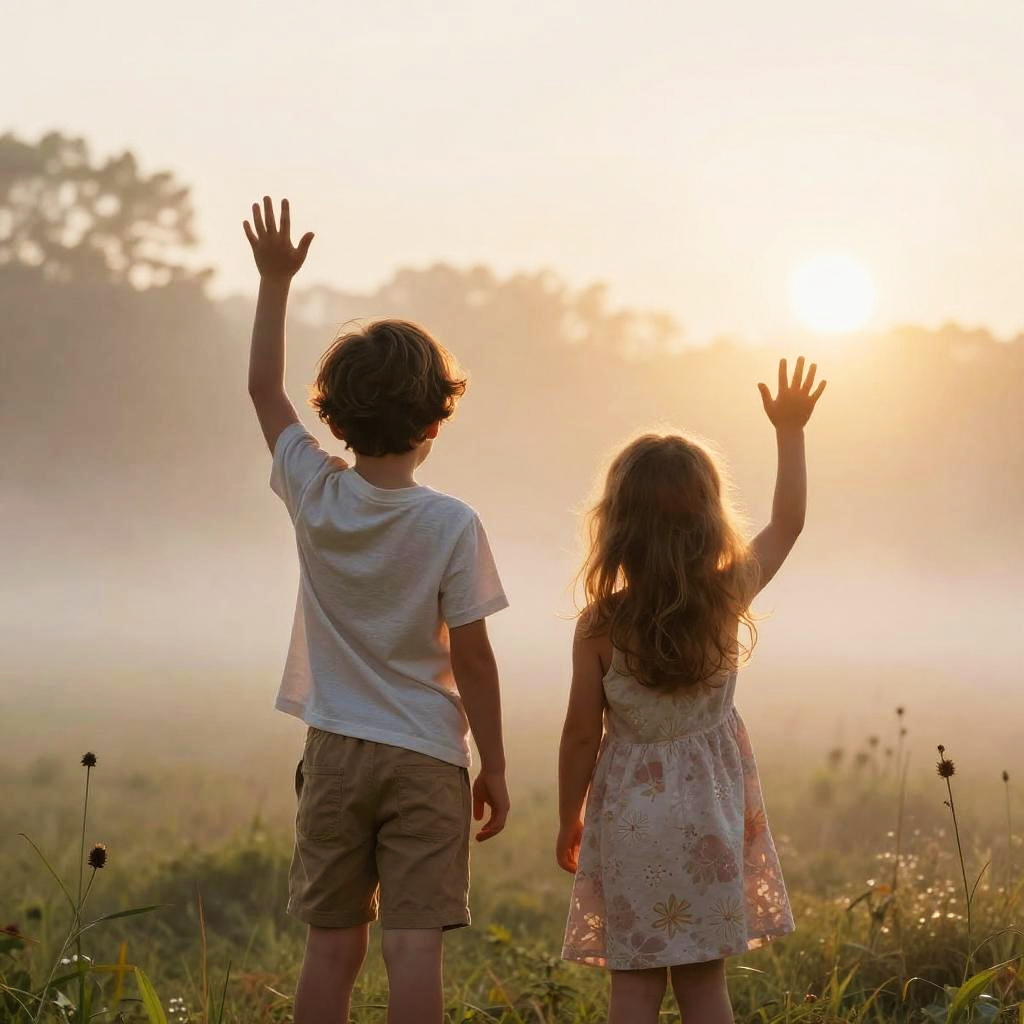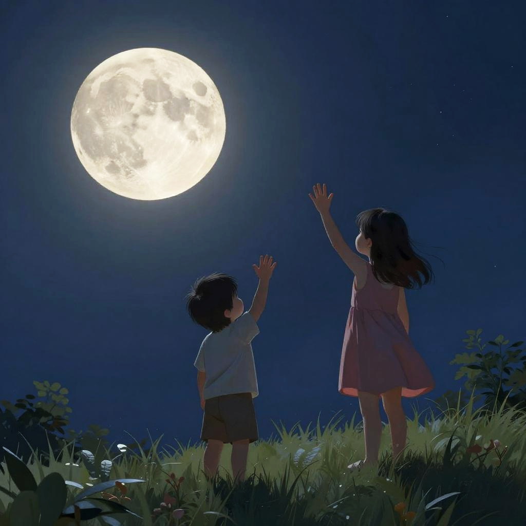 A playful boy and playful girl waving their hands, dreamy matte painting with night-time, volumetric lighting, moonlit backdrop, smooth and trending on ArtStation