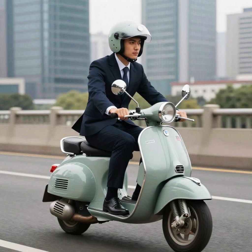 Realistic photo.A rider on a classic moped, wearing a sharp business suit and a futuristic visor, cruising through a modern skyline. realistic photo