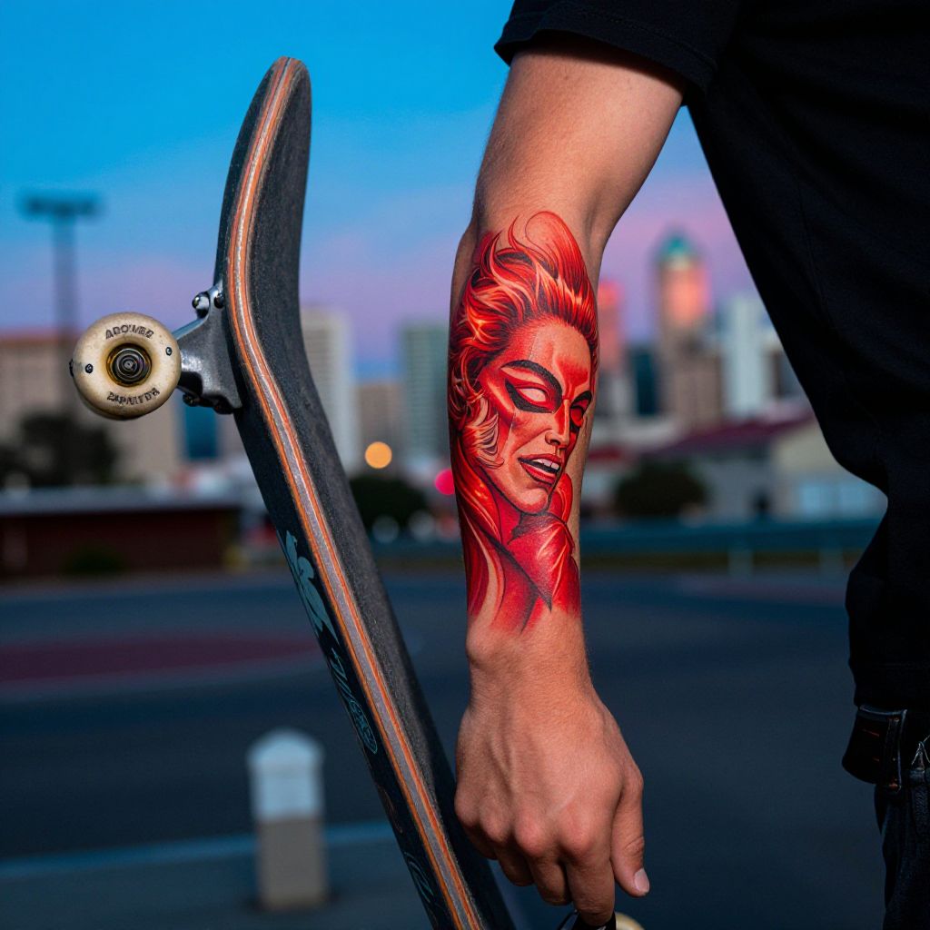 Photograph of a person's right arm, featuring a vibrant, detailed red and black tattoo of a woman's face with flowing hair, on a skateboarder's forearm. The person holds a skateboard with a visible black deck and white trucks, angled diagonally. Background shows a blurred urban skyline with a blue sky at dusk. The person wears black clothing, with only the arm and part of the torso visible. The tattoo's style is realistic with bold lines and intense colors, contrasting sharply with the person's skin tone and the dark clothing.