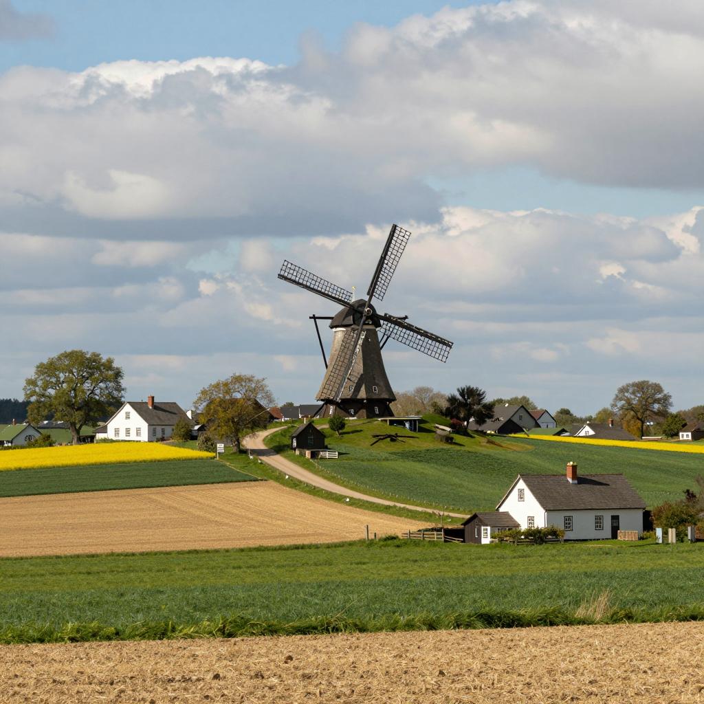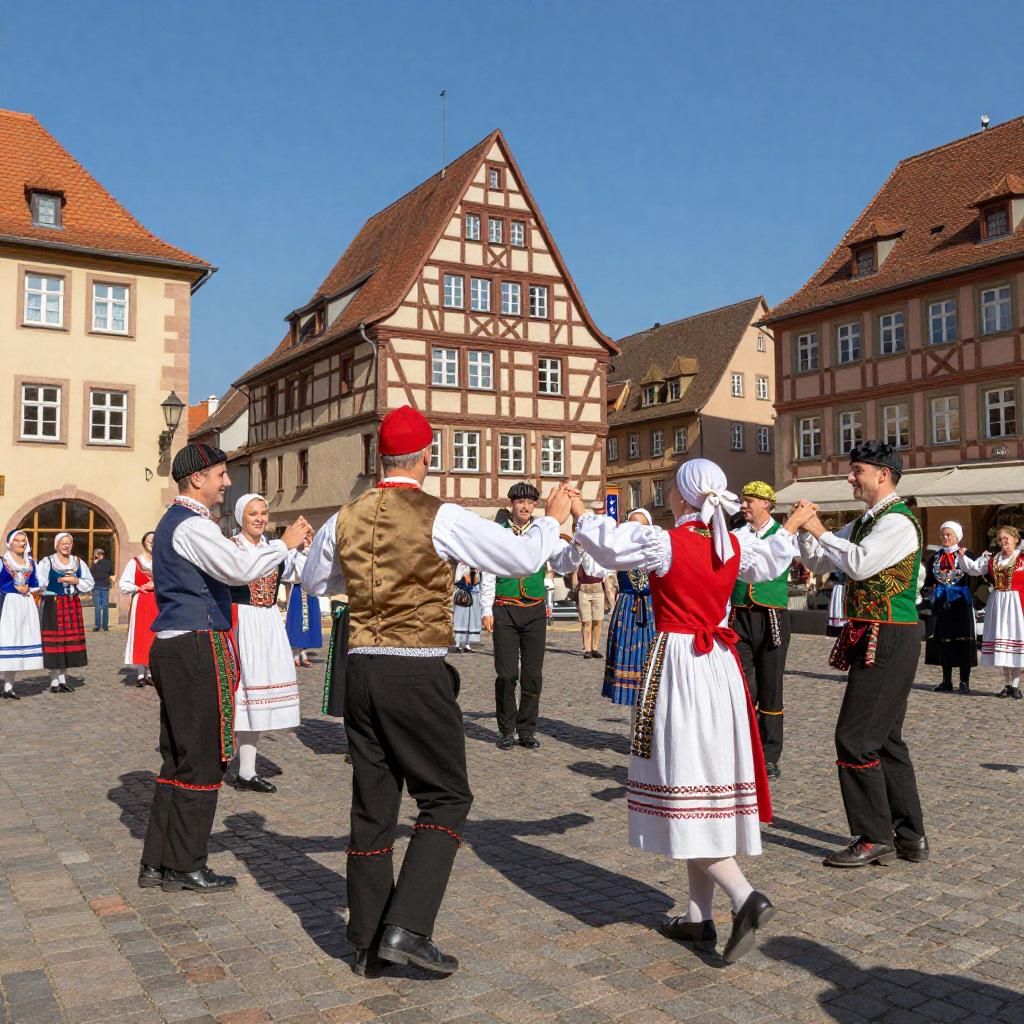 A lively scene of people dressed in colorful traditional clothing performing a group folk dance in a vibrant European town square. The background features historical half-timbered buildings and a clear blue sky, highlighting the joyful cultural celebration.