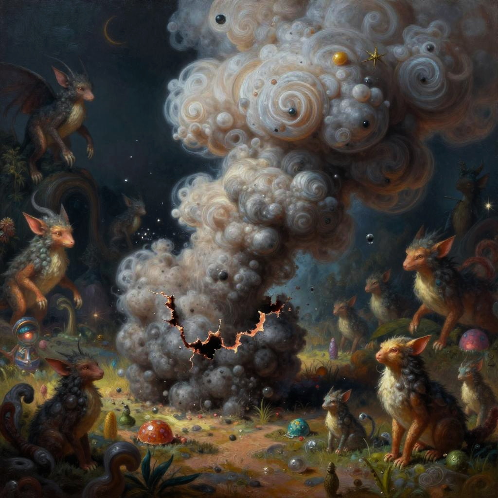 An extremely detailed oil painting of a surreal and mystical scene featuring fantasy creatures resembling small dragons or mythical beasts surrounding a swirling, cloud-like interdimensional phenomenon that appears to rip spacetime. The dark, atmospheric background enhances the glow effects and god rays, creating a dreamlike, twisted reality. The artwork is hyper realistic with vivid colors and intricate details, resembling a high-quality 8k digital render.