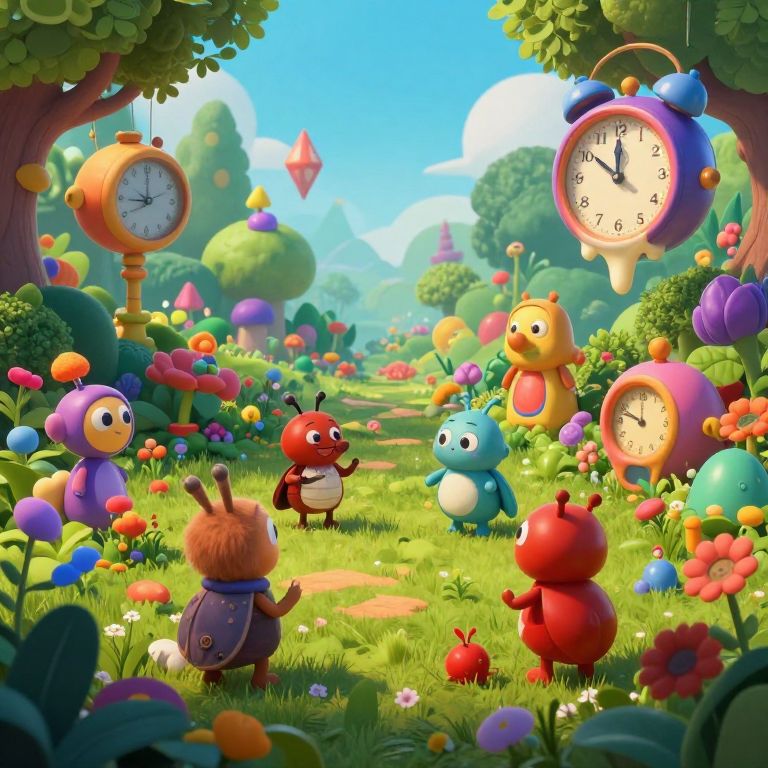 Vibrant CGI scene of colorful, whimsical creatures in a sunny, flower-filled garden with floating clocks and lush trees. Playful, fantasy atmosphere