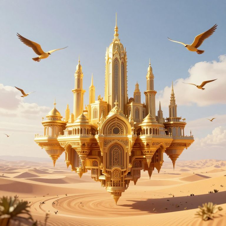 A fantastical 3D-rendered scene depicts a grand, golden floating city with intricate architecture hovering serenely above a vast desert landscape, surrounded by winged birds soaring gracefully against a serene sky, evoking a dreamlike, otherworldly atmosphere.