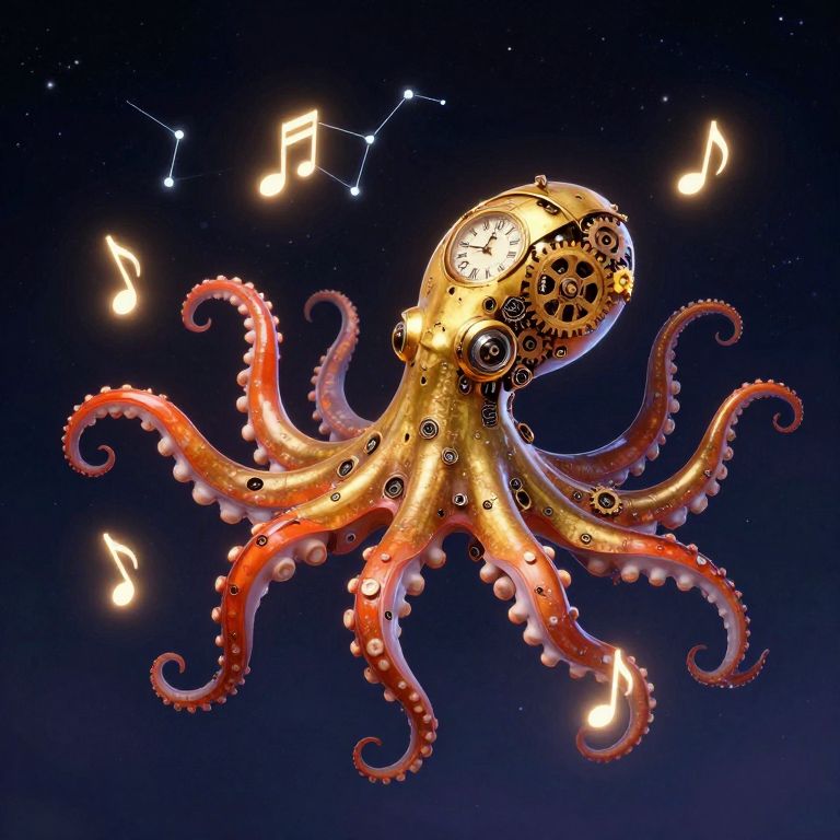 Glowing musical notes dance around a whimsical clockwork octopus, its golden mechanical head adorned with intricate gears, as its eight vibrant tentacles gracefully swirl against a starry night sky, creating a celestial symphony that transforms into shimmering constellations.