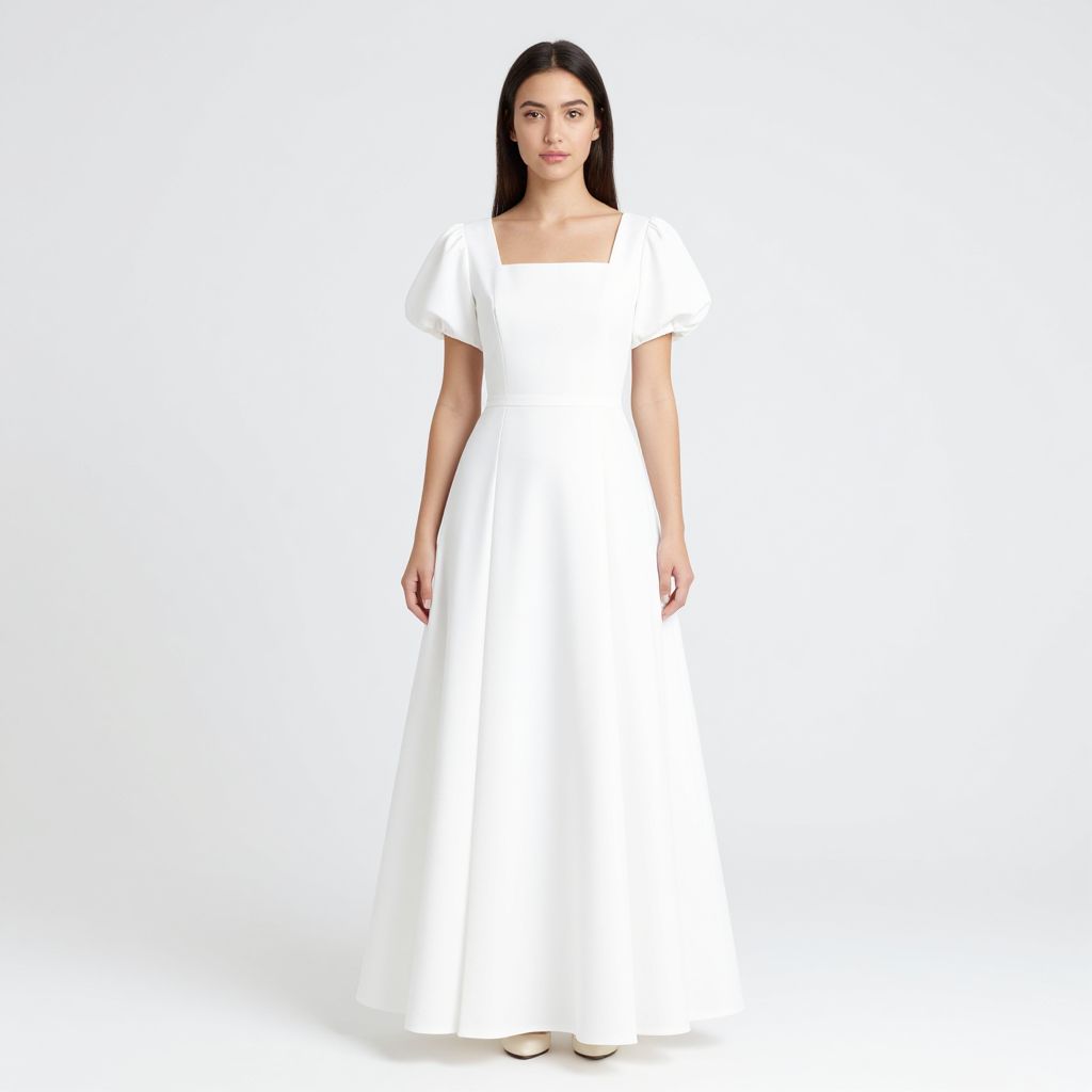 Photograph of a young woman with long black hair standing against a plain white background. She is wearing a full-length, white, off-the-shoulder dress with short puffed sleeves. The dress is simple and elegant, with a straight, flowing skirt that reaches the floor. She has a neutral expression and is standing with her arms relaxed by her sides. Her skin tone is light brown, and she is wearing black pointed-toe shoes. The image is brightly lit, emphasizing the clean, minimalistic style of the outfit and background.