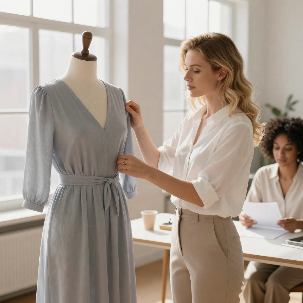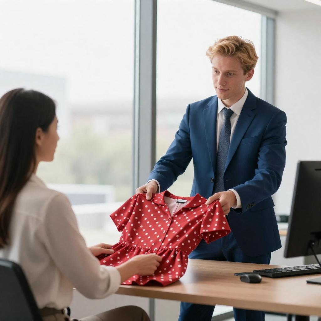 Sunlit Office: Man Handing Polka-Dot Dress