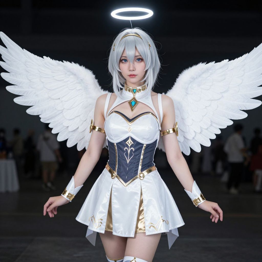 Photograph of a young woman in an anime-style cosplay outfit, resembling a heavenly angel. She has short, silver hair, pale skin, and blue eyes. She wears a white, sleeveless dress with a black, heart-shaped bodice and gold accents, along with white wings and a glowing halo above her head. Her outfit is accessorized with a green gemstone necklace and gold bracelets. The background is dark, with blurred figures and a dimly lit event setting. Her expression is neutral, and she stands confidently with her arms slightly outwards. The image has a digital, polished finish.