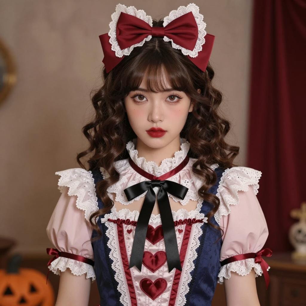 Queen hearts girl halloween, photo of a young woman, gothic lolita style, dark brown curly hair, red bow with white lace, intense brown eyes, red lipstick, blue and red corset dress with heart patterns, black ribbon, white lace trim, soft pink sleeves, detailed makeup, blurred brown and red background, realistic, high detail, portrait, front view, realistic CGI, detailed ures, natural lighting, feminine, elegant, vintage-inspired, gothic elements, digital art