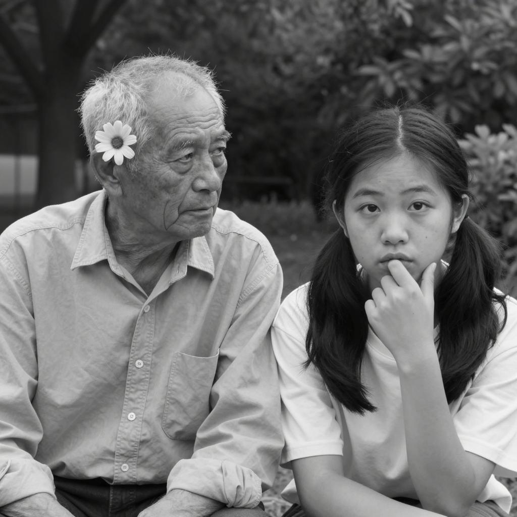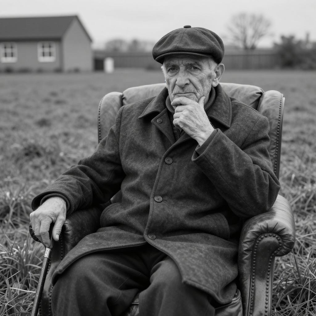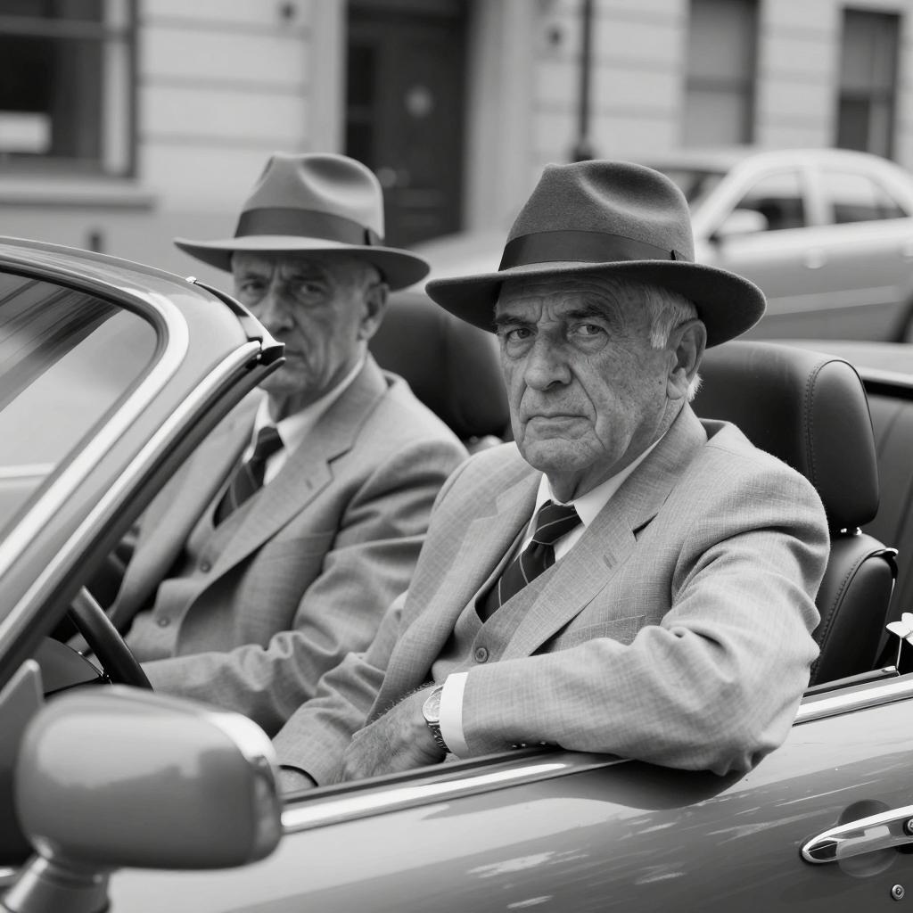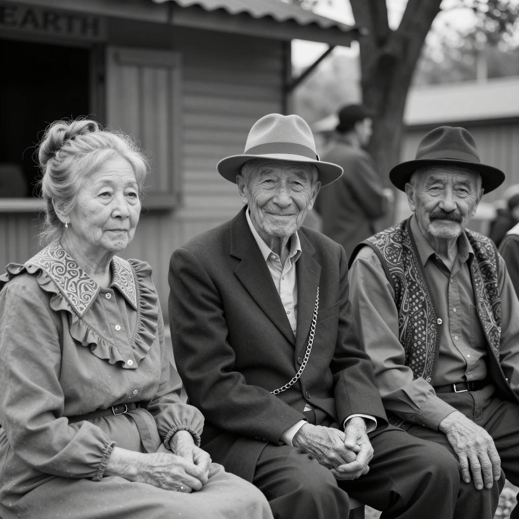 Black-and-white photograph of three elderly people sitting outdoors. Woman on left with elaborate updo, ruffled dress, and patterned collar. Man in center with light-colored hat, dark suit, and chain across chest. Older man on right with dark mustache, patterned vest, and dark hat. Background includes a wooden structure with "EARTH" partially visible. Woman's expression is neutral, man in center is smiling, man on right is slightly frowning. Tree and blurred person in background.