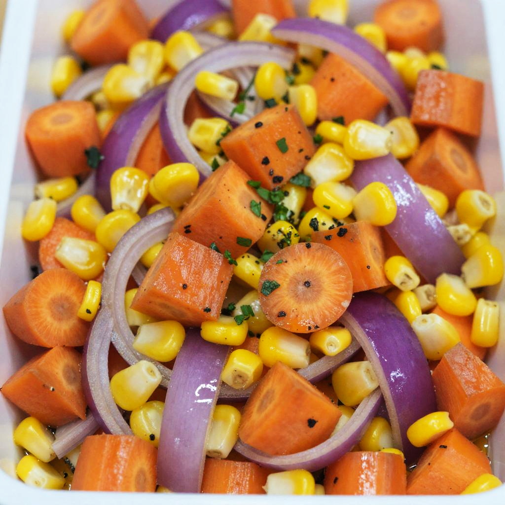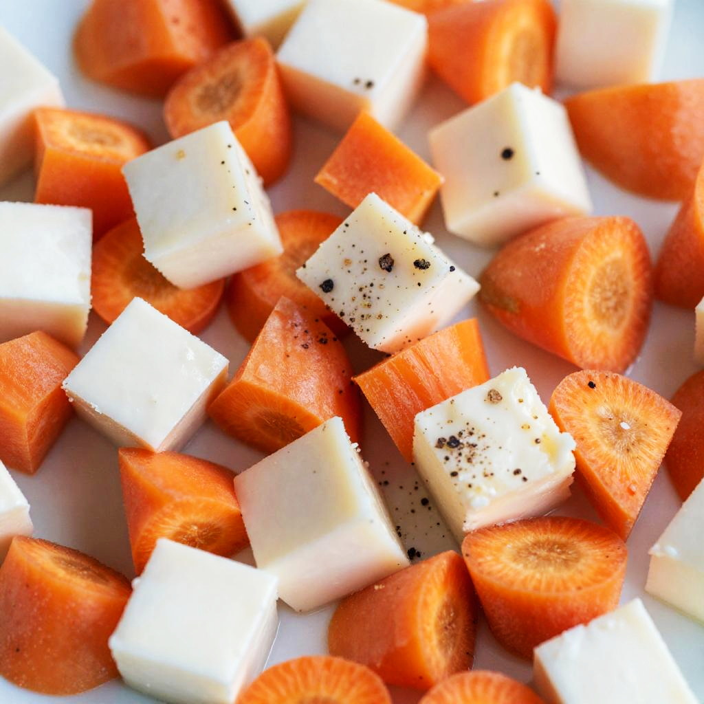 Close-up photo of a colorful salad mix. It's filled with diced orange carrots and white cubes of cheese, sprinkled with black pepper. The cheese has a slightly melted texture, and the carrots are fresh and vibrant. The image is highly detailed, focusing on the contrast between the orange and white pieces, with the pepper adding a hint of black specks throughout.