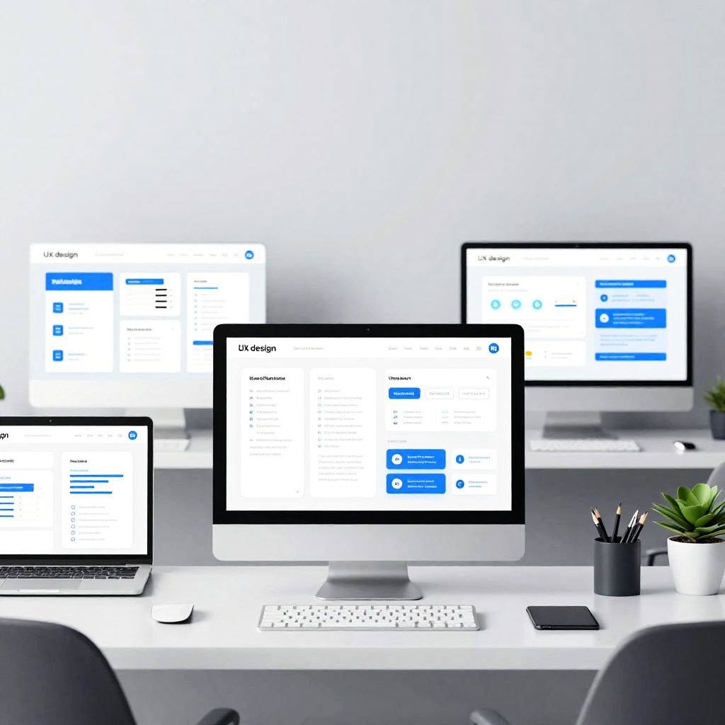 UX design LinkedIn banner showcasing a sleek, modern workspace with digital wireframes and prototypes on multiple screens, clean lines, muted blues and grays, minimalist style, professional and tech-savvy atmosphere, high resolution.