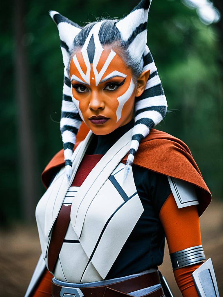 Ahsoka tano girls costume, 1girl, solo, blurry background, belt, looking at viewer, blurry, facepaint, alien, outdoors, upper body