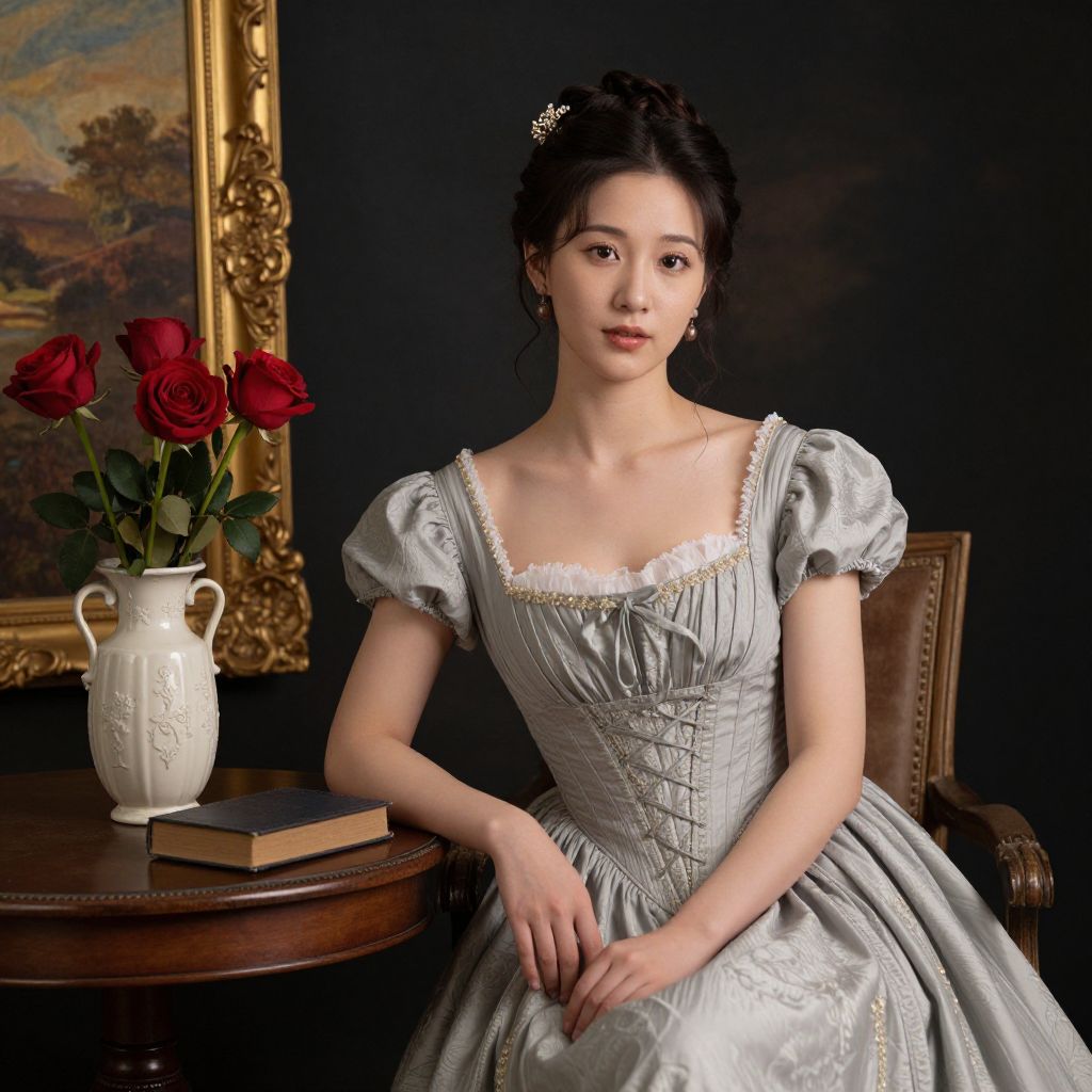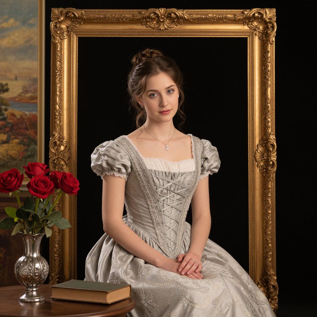 Photograph of a young woman with fair skin and dark brown hair in an elegant updo, sitting in front of an ornate, gold-framed portrait. She wears a white, Victorian-style dress with puffed sleeves and intricate lace detailing. She has a delicate necklace and a subtle smile. To her right, a silver vase holds vibrant red roses, and a closed book rests on a wooden table. The background is black, emphasizing the subject and the gold frame. A painted landscape is partially visible on the left.