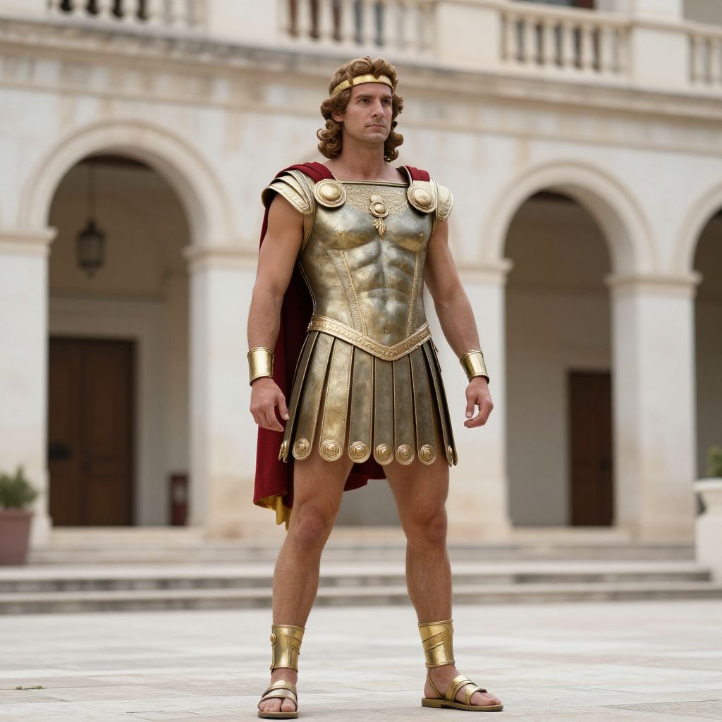 Photograph of a muscular man with curly brown hair, wearing ancient Greek warrior armor, standing in front of a classical building.