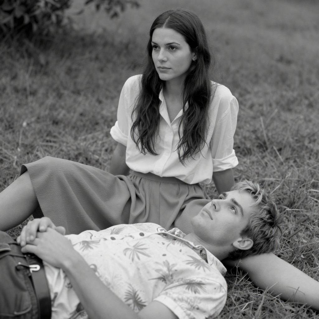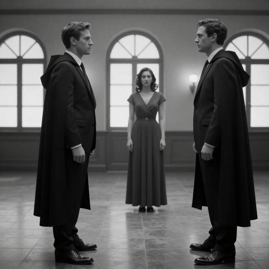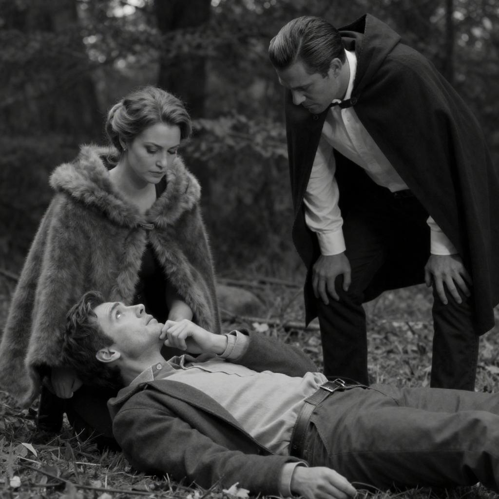 Black-and-white photograph of three people in a forest. A man lies on the ground, looking up with a concerned expression. A woman with a fur cloak stands beside him, gripping his chin. A man in a dark cape and white shirt leans over, looking at the woman. Dense foliage in the background. The woman's hair is styled up, the men's hair is slicked back.